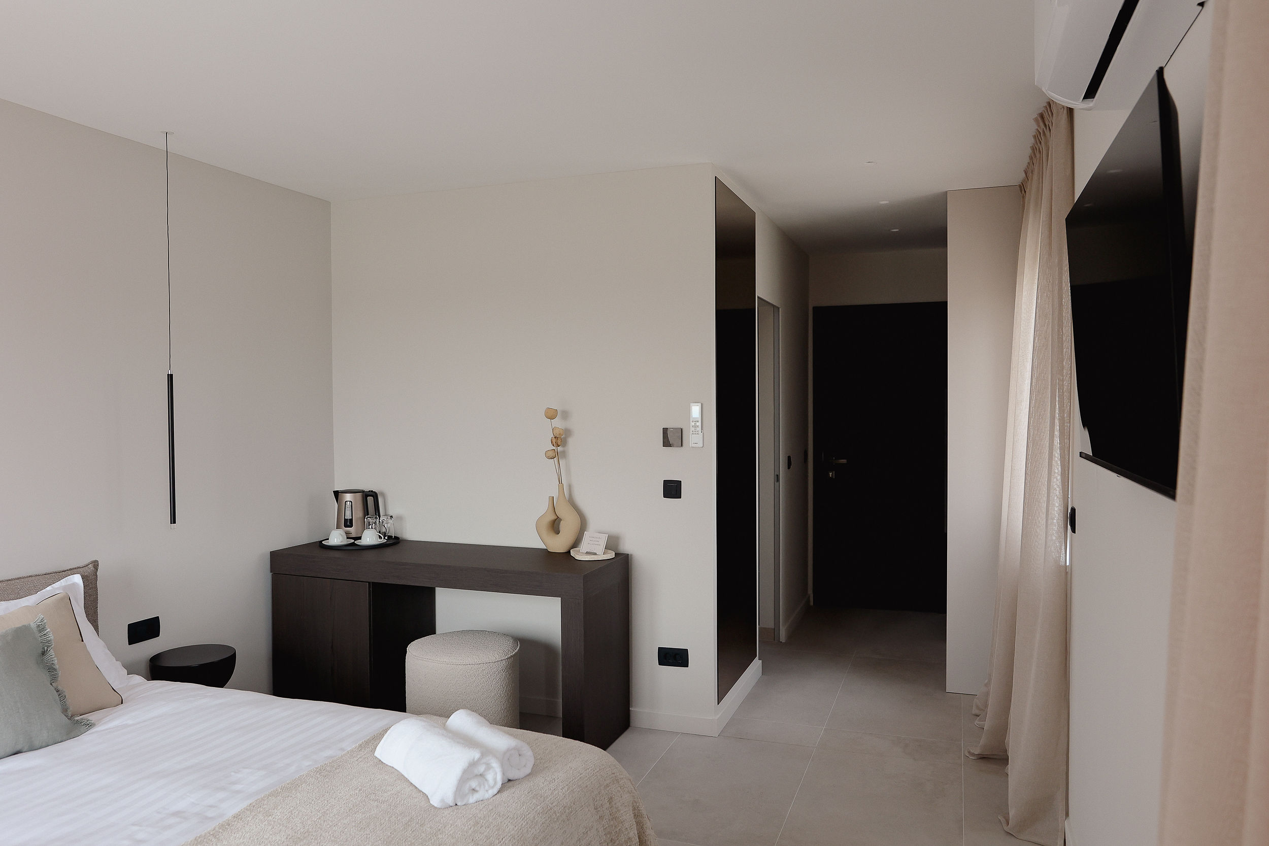 Nestled on the first floor, our exquisite Premium Room 04 boasts a refined color palette, sophisticated wooden furnishings, and a spacious console table. The elegant bathroom features a sleek walk-in shower, while the room’s south-facing orientation fills the space with natural light, creating an airy and inviting atmosphere.
