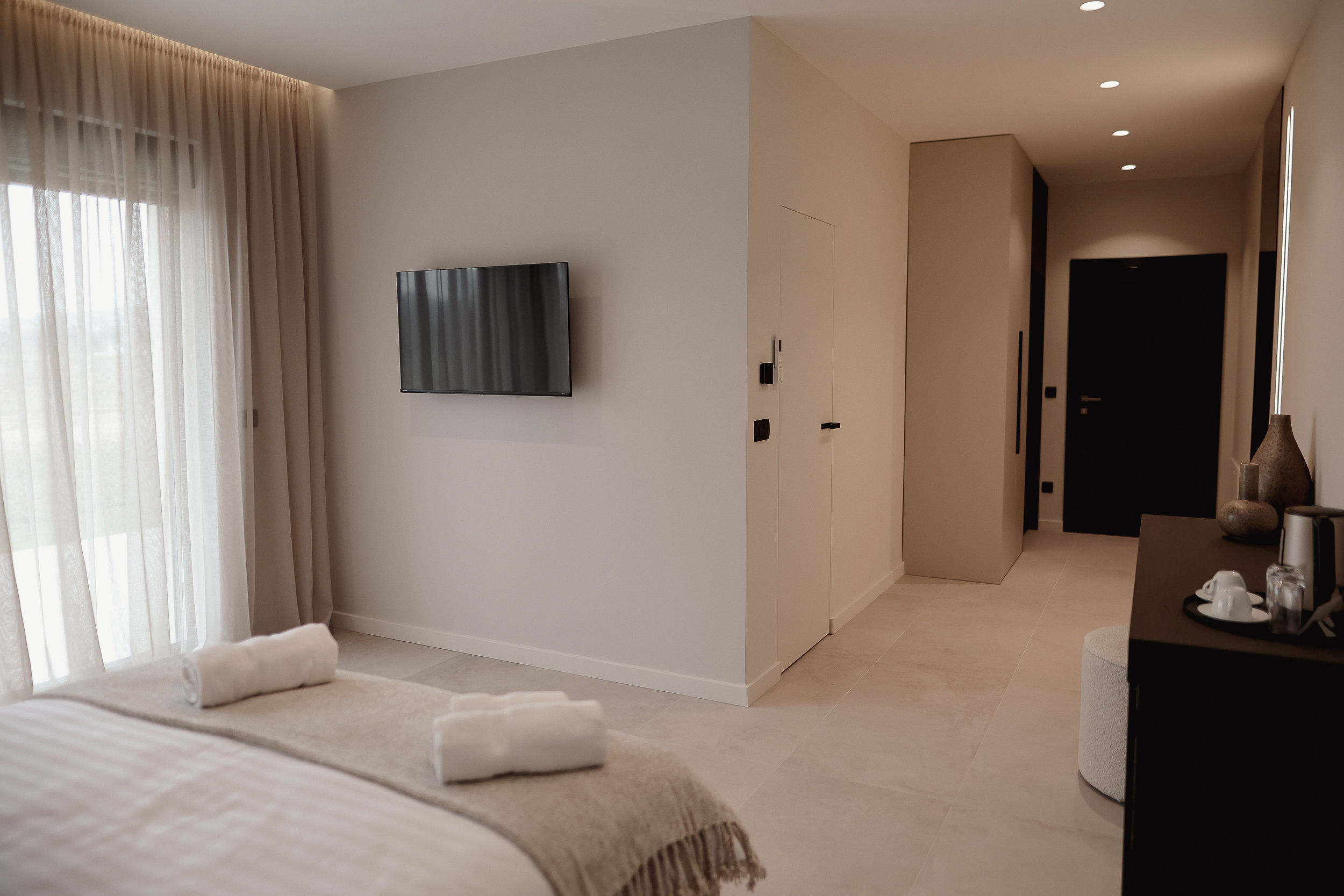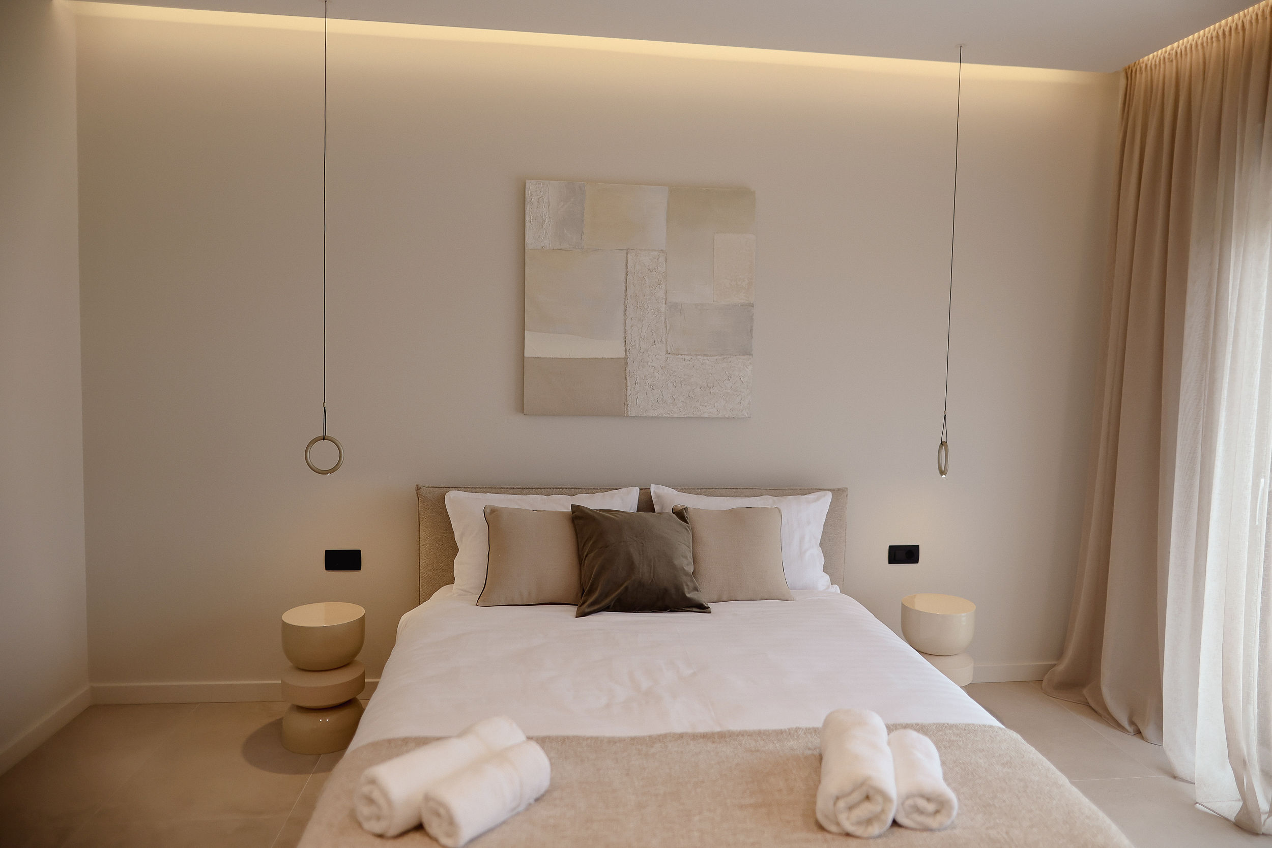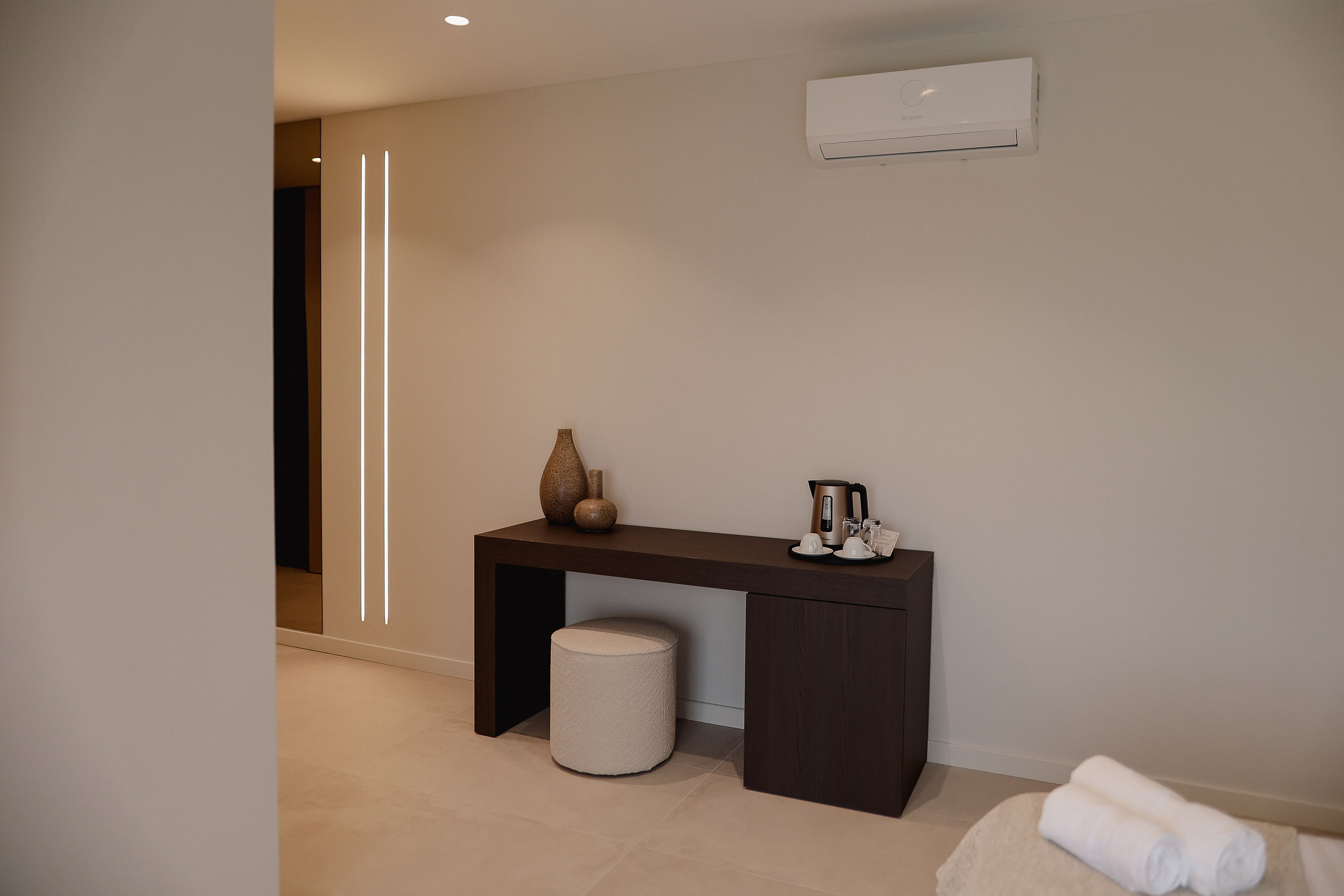 Our spacious Premium Room 02, adorned in a subtle color palette, offers an ambiance of serene sophistication. With heated floors and a sunlit orientation, it is the perfect retreat for relaxation—whether indoors or on the expansive terrace, where you can unwind with a drink while admiring the sunset.